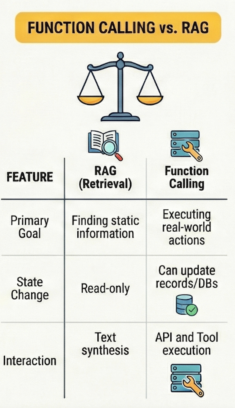 Function calling excels when you need the LLM to actually do things beyond just reading and synthesizing information. Query a live database for current information, send notifications, create tickets, trigger workflows, update records, or any scenario where the LLM needs to interact with external systems in real-time rather than just reading pre-indexed documents. If your use case requires the model to affect state changes in your systems, you need function calling rather than RAG.
