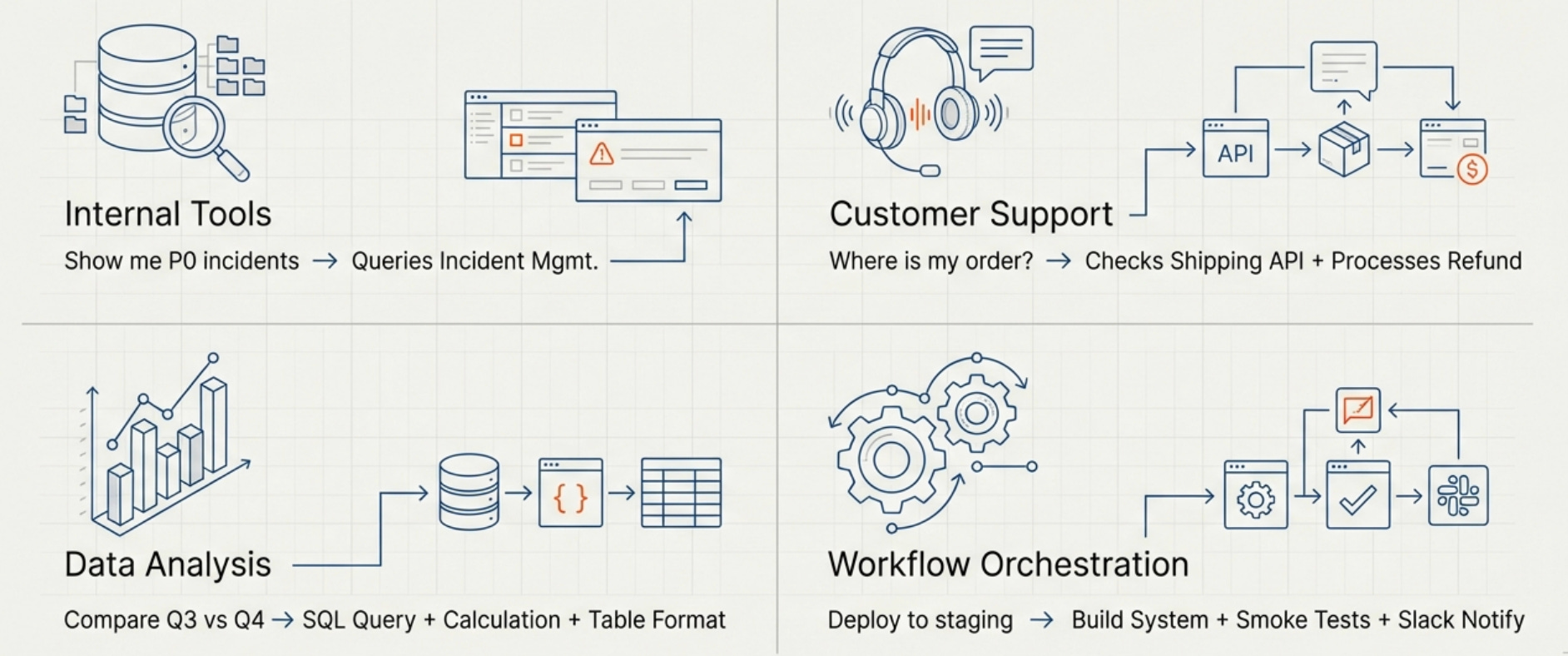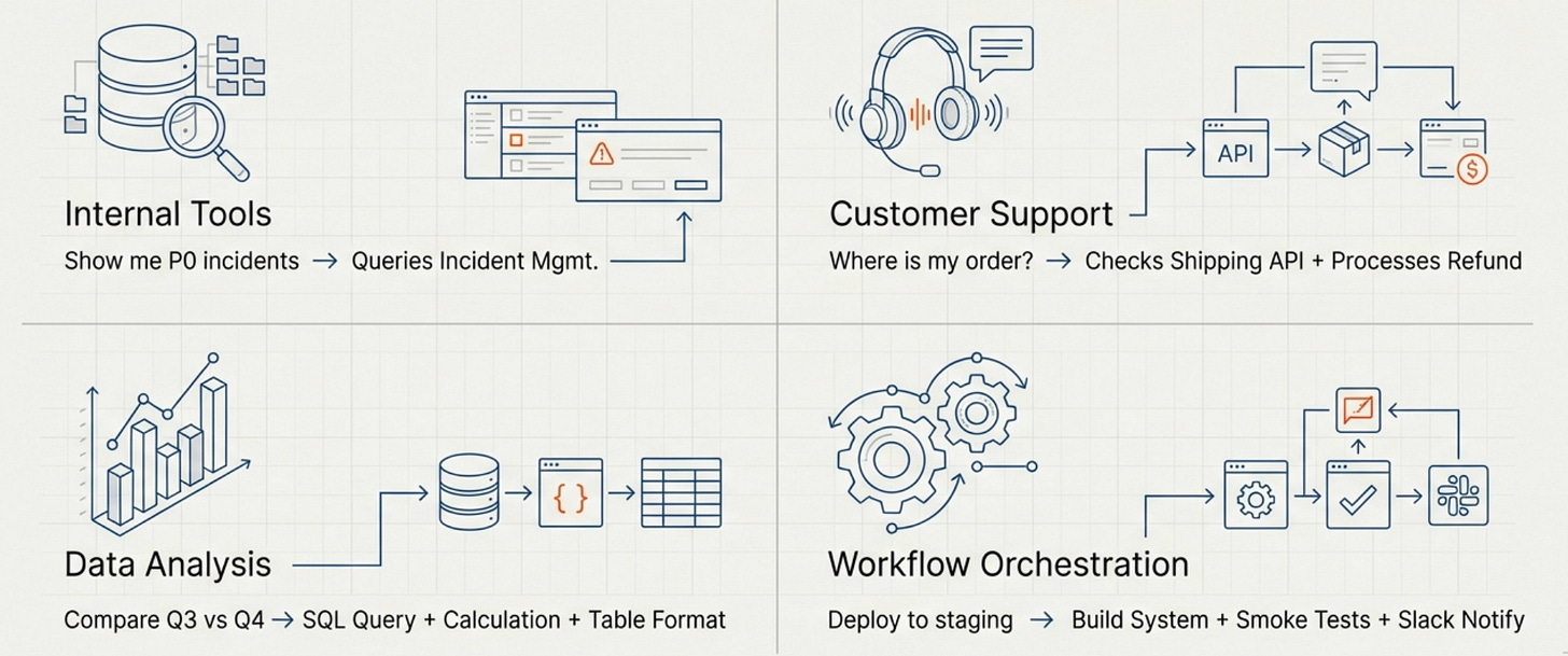 Internal tools and automation are one of the strongest use cases. Employees can ask questions in natural language and the system can query the right databases, APIs, or services to get answers. “Show me all P0 incidents from last week” becomes a function call to your incident management system, while “Create a ticket to investigate the API latency spike” becomes a function call to your ticketing system with appropriately formatted parameters.