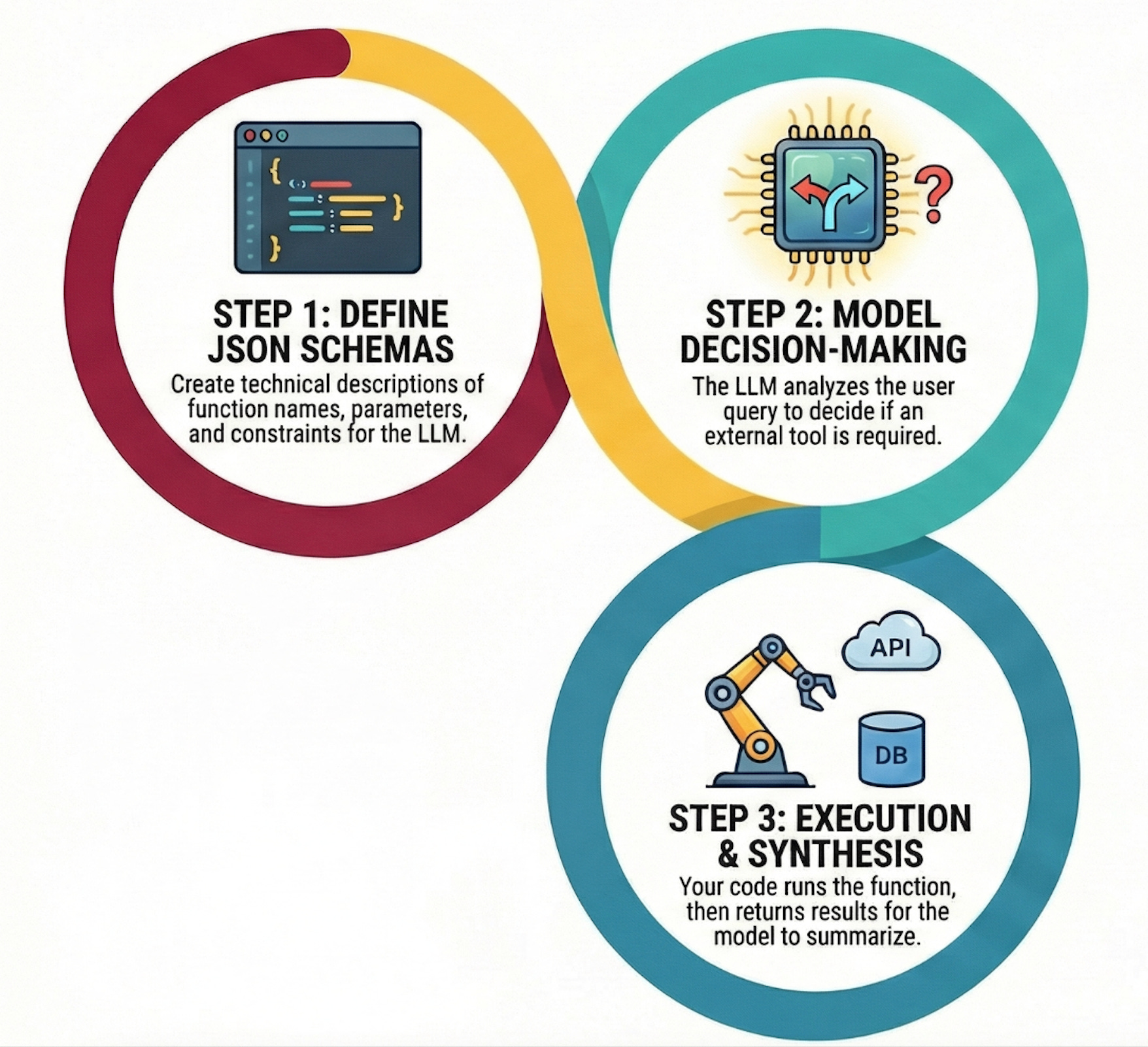 Function calling follows a specific pattern that you’ll implement over and over once you understand it. There are four main components that each need careful attention to prevent the kind of chaos I experienced with my database tool.